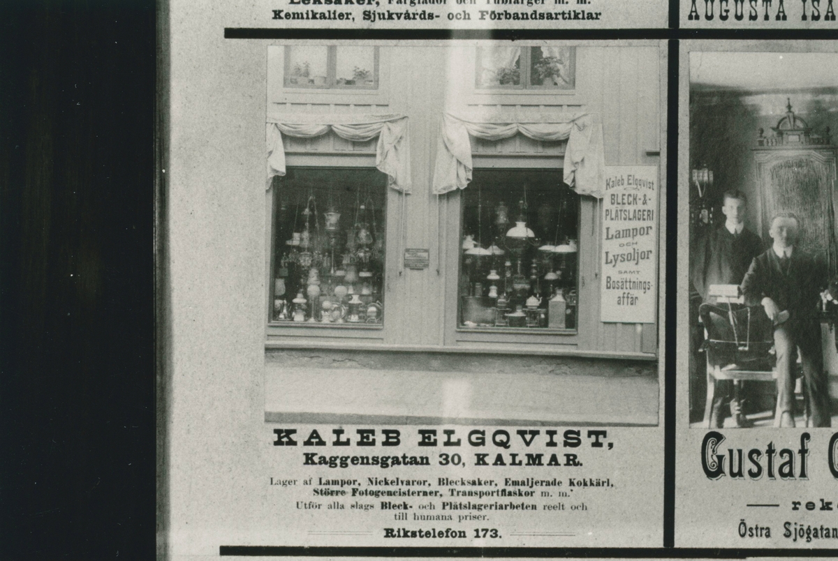 Reklamaffisch med texten: "Kaleb Elgqvist. Kaggensgatan 30, Kalmar. Lager af Lampor, Nickelvaror, Blecksaker, Emaljerade kokkärl. Större fotogencisterner, transportflaskor m.m. Utför alla slags Bleck- och Plåtslageriarbeten reelt och till humana priser. Rikstelefon 173."