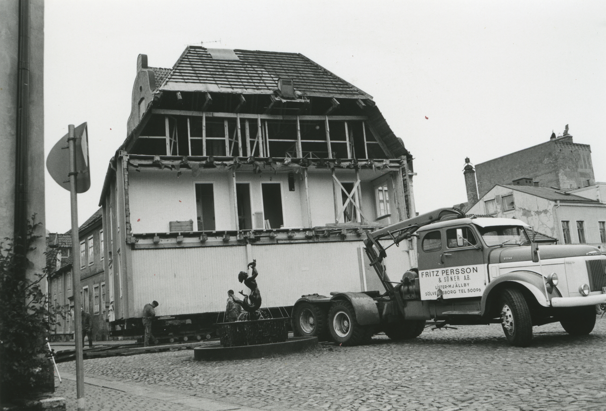 Flyttning av Areskogska huset 30/9 - 3/10, 1970. Här ser man hur huset är kapat.