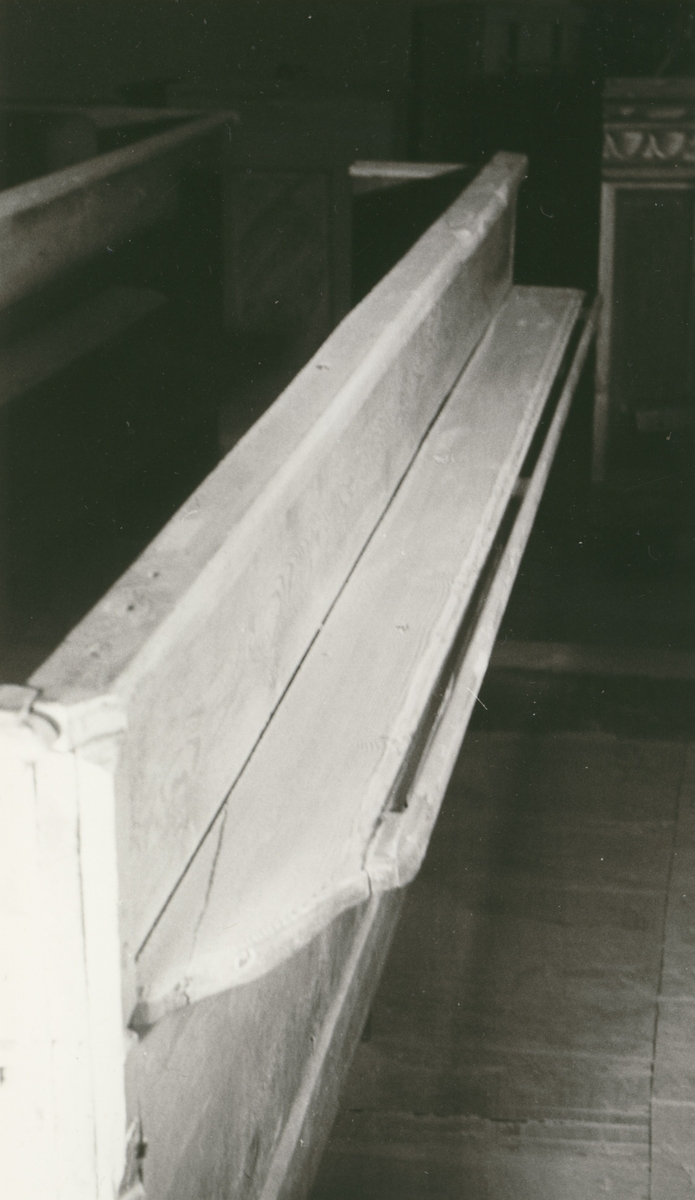 Bänkinredningen i slottskyrkan med psalmbokshylla.