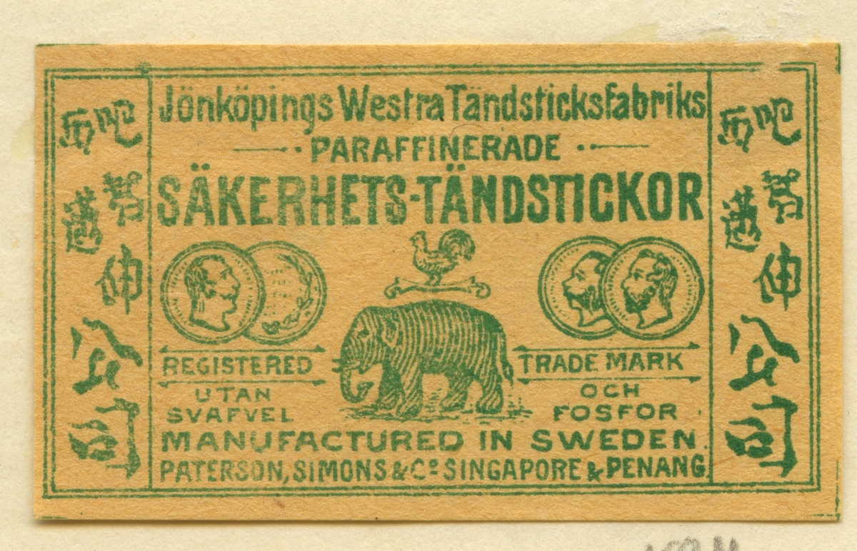 Tändsticksetikett från Jönköpings tändsticksfabrik, "Jönköpings Westra Tändsticksfabriks paraffinerade säkerhets-tändstickor, Paterson Simons & Co Singapore & Penang".
