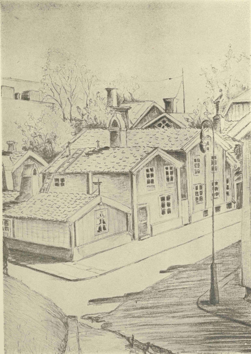 Teckning av Tripp-trapp-trull, tre små hus som bevarats på västra Kvarnholmen där annars merparten av bebyggelsen är sentida.