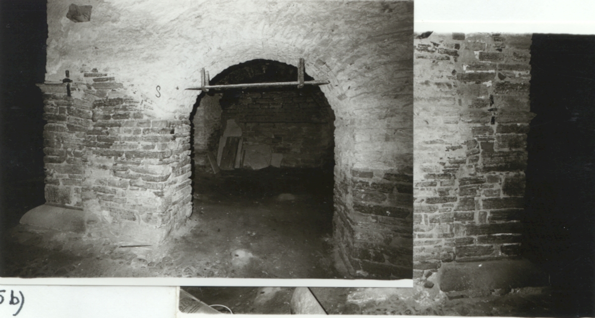 Bottenvåningen, östra längan rum 43 - Kungsköket. Främre muren från utsidan nedre delen. (Två foton med något olika perspektiv).