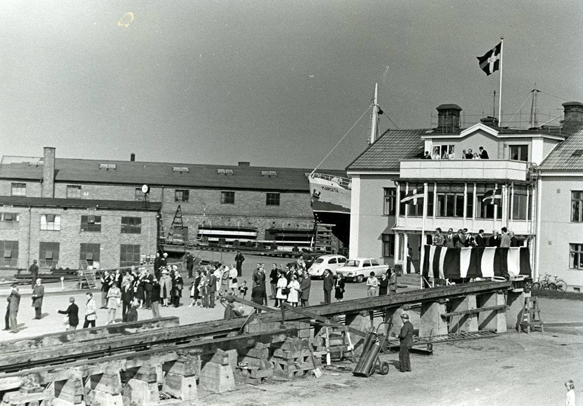 Åskådare vid sjösättning av fartyg från en stapelbädd på Kalmar varv.
