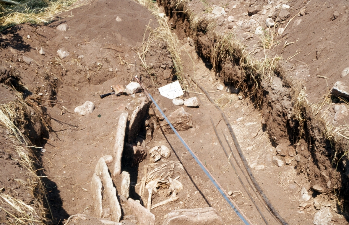 Undersökt grav med kvarlevor vid utgrävning i Vickleby 1973.