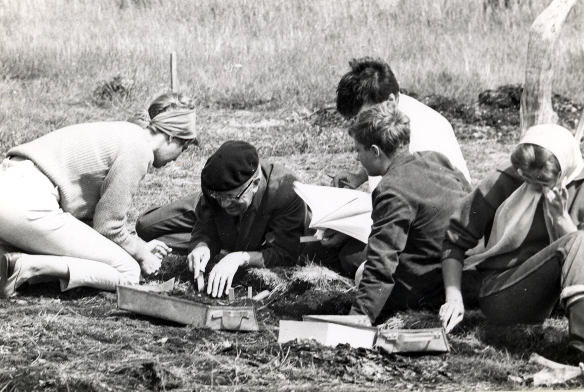 Kung Gustaf VI Adolf och kronprins Carl Gustaf vid utgrävningarna av Skedemosse.