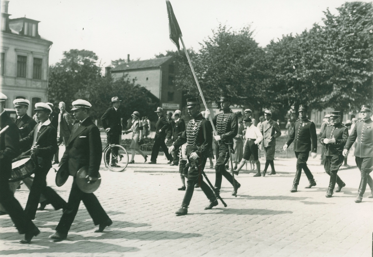 Kalmar Regemente på marsch vid Tullslätten 1929. I täten Lyckhemspojkarnas musikkår med bland andra Simon trumslagare. Ledare för kåren var en man som hette Nilsson (Musik-Nisse).