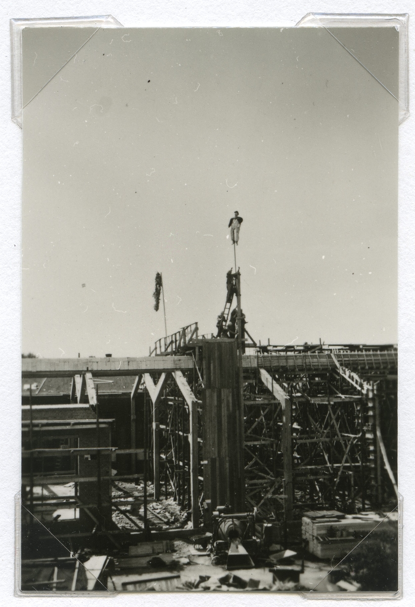 Spantölshån på nybygget på Manilla, Sandås, Kalmar. "Gubben" uppsätts. Efter tre timmar