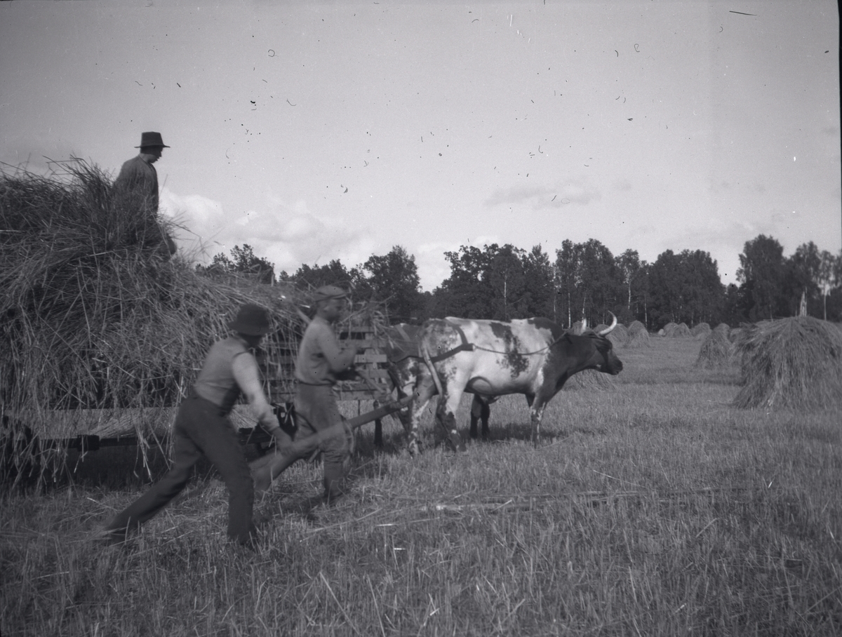 Oxar och arbetare. Lassar sädeskärvar.