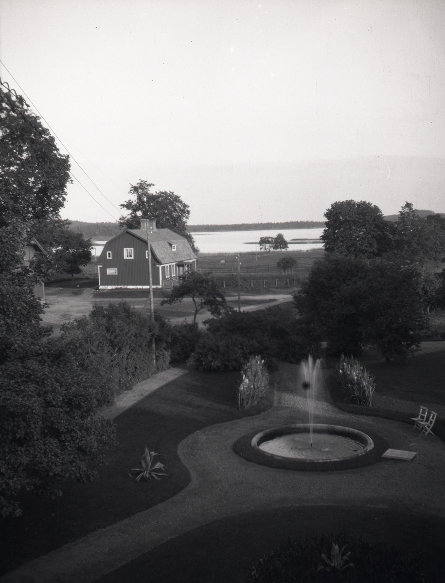 Utsikt över Tunasjön och inspektorsbostaden. Fontän i förgrunden.