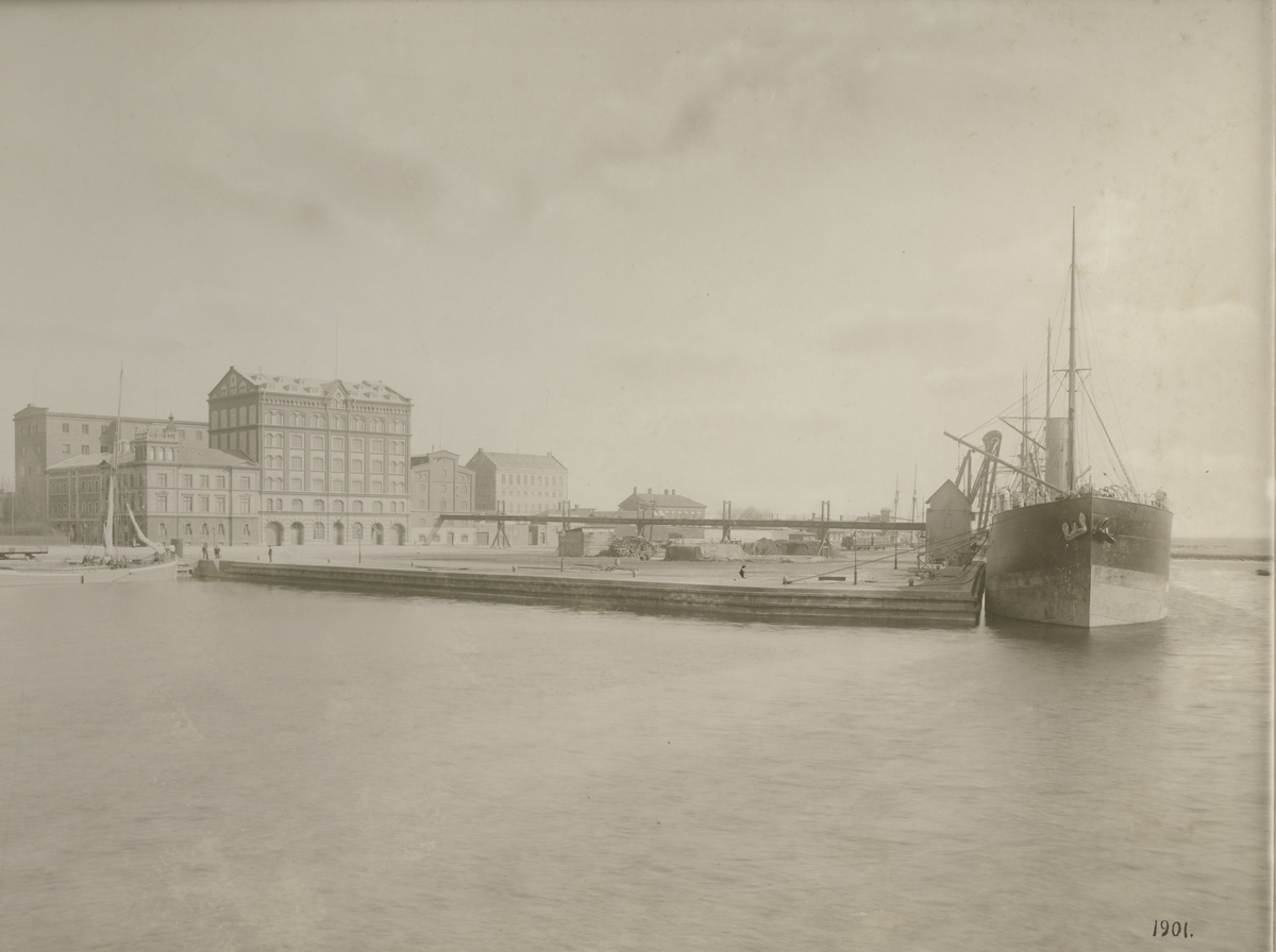 Fartyg lossar spannmål via elevatorn vid Ångkvarnen i Kalmar.