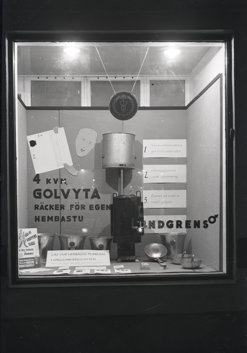 Skyltfönster på Lungrens järnhandel, i fönstret visas vad som behövs för att bygga en bastu.