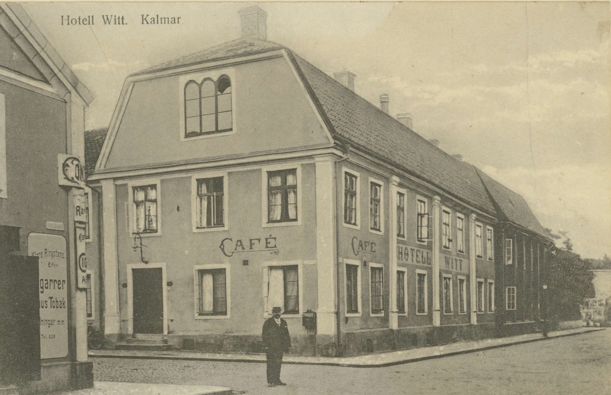 Hotell Witt före fasadens omändring , som skedde omkring 1928. Gavelfönstrets form förändrades bl.a då, varjämte väggarna putsades med terrasit. Tidigare var väggen slätputsad och färgad gul, med pilssastrar och listverk i vitt. Rivet år 1939.