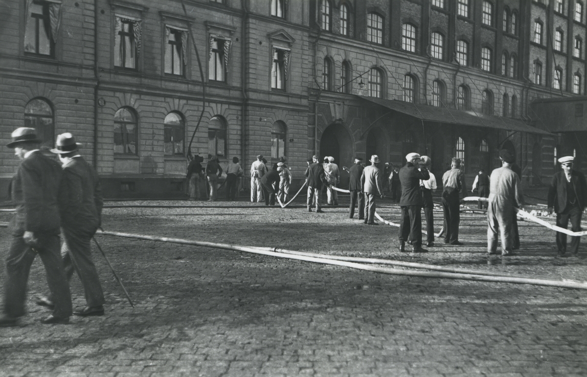 Ångkvarnen i Kalmar. Branden juli månad 1935. Byggnadens östra del, mot Elevatorkajen, kom nästan oskadd ur branden. T o m markiserna vid fönstren var oskadda.