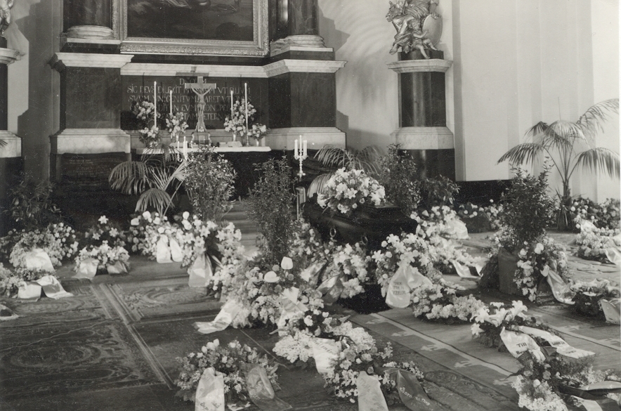 Begravningsgudstjänst i Kalmar domkyrka med kistan stående framför altaret omgiven av kransar.