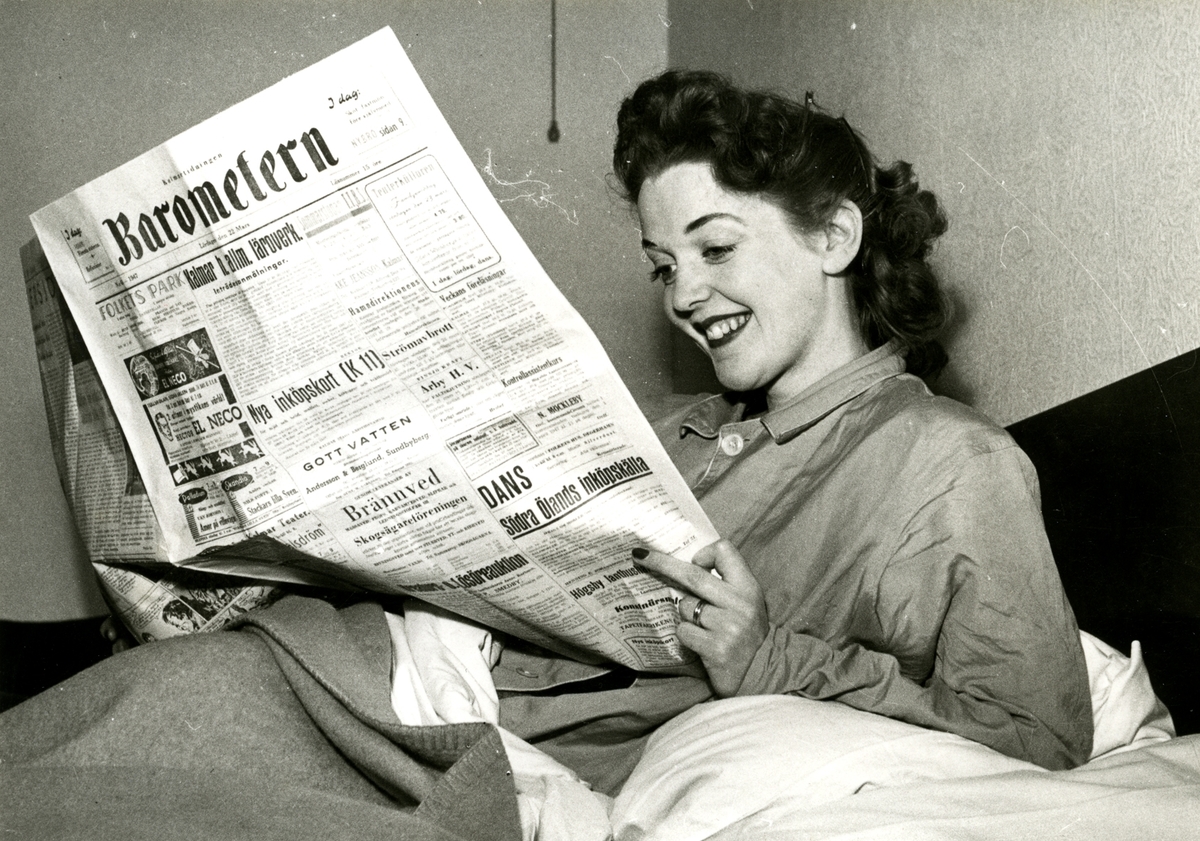 En skådespelerska läser tidningen i sängen.