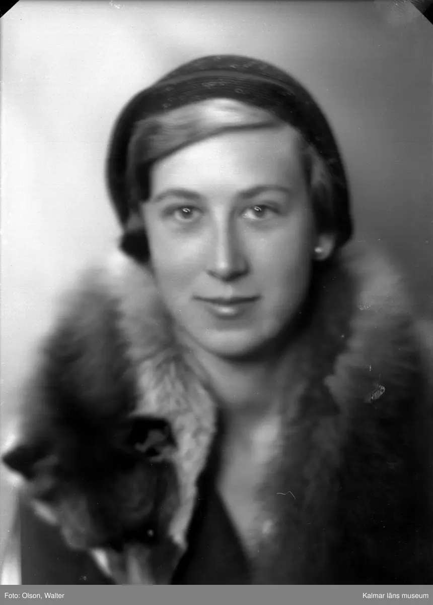 Ateljébild på kvinna i rävboa och hatt. Enligt Walter Olsons journal är bilden beställd av fröken S Swartz ifrån Odengatan 1 i Kalmar.