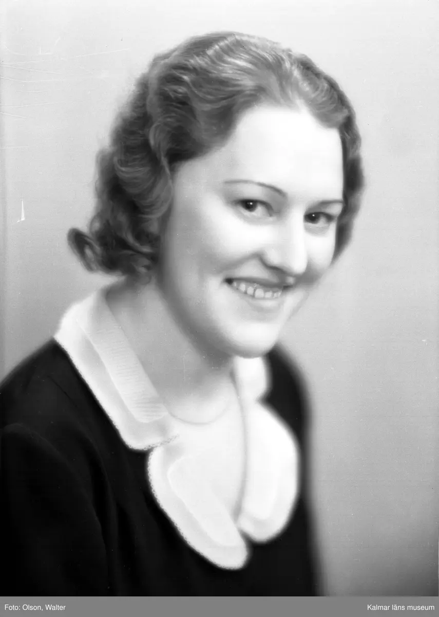 Ateljébild på en kvinna i klänning, halsband och ondulering. Enligt Walter Olsons journal är bilden beställd av Asta Christoffersson ifrån Odengatan 4 i Kalmar.