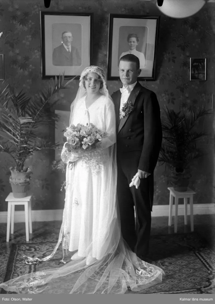 Bröllopsbild på brudpar. Enligt Walter Olsons journal är bilden beställd av C E Skoglund ifrån Kvarneden.