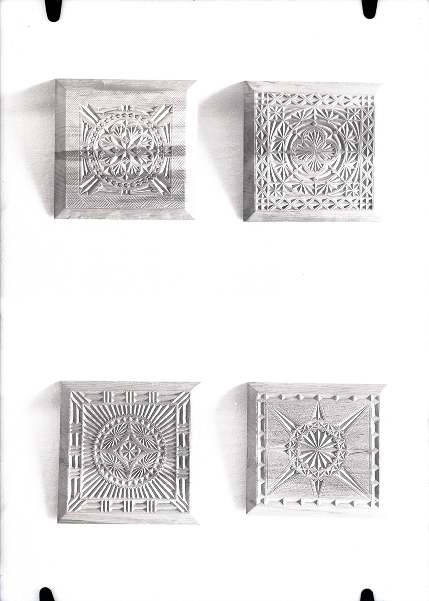 Vanliga föremål som dekorerats med karvsnitt är kistor, svepaskar, andra askar och skärbräden. Beställare Alb. Friberg. St. Eriksgatan 10. Ur Walter Olsons negativsamling.