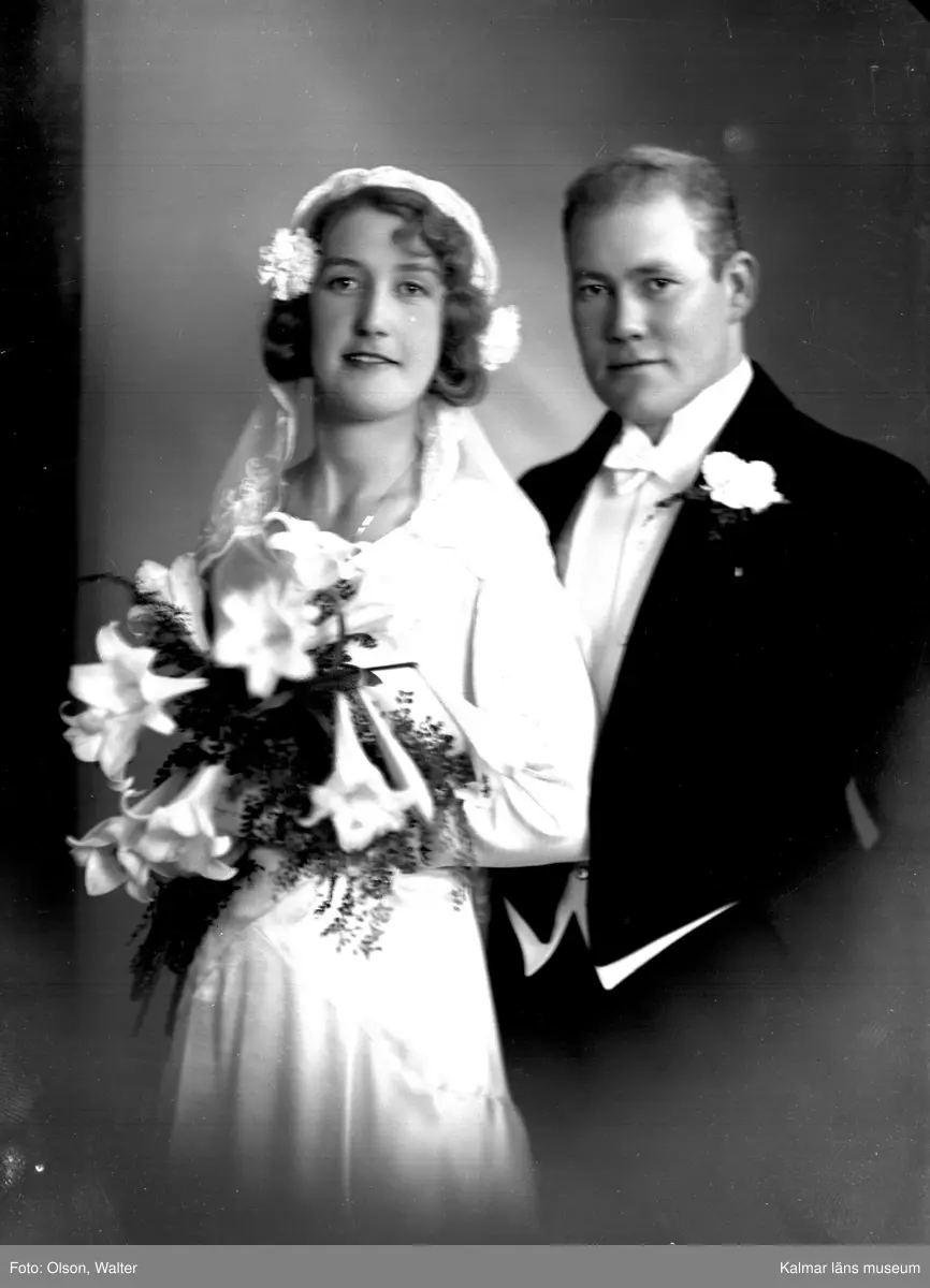En bröllopsbild. Kvinnan har en brudslöja och brudklänning på sig ihållandes en blombukett. Mannen har frack. Enligt Walter Olsons journal är bilden beställd av notarie A Grauers ifrån Stensviksvägen 9 i Kalmar.