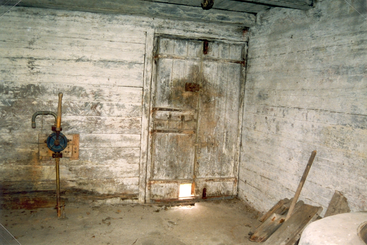Interiör brygghus - grovkök, ingång från gamla husets gavel direkt till grovkök med vattenpump, vitkalkade väggar.