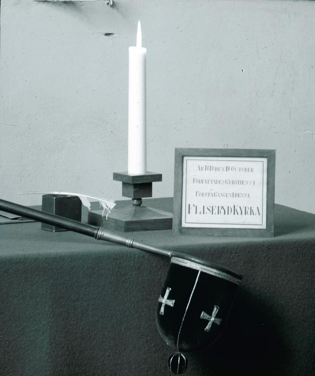 På minnestavlan till höger står det: "År 1818 den 18 october förrättades gudstienst första gången i denna Fliseryd kyrka."