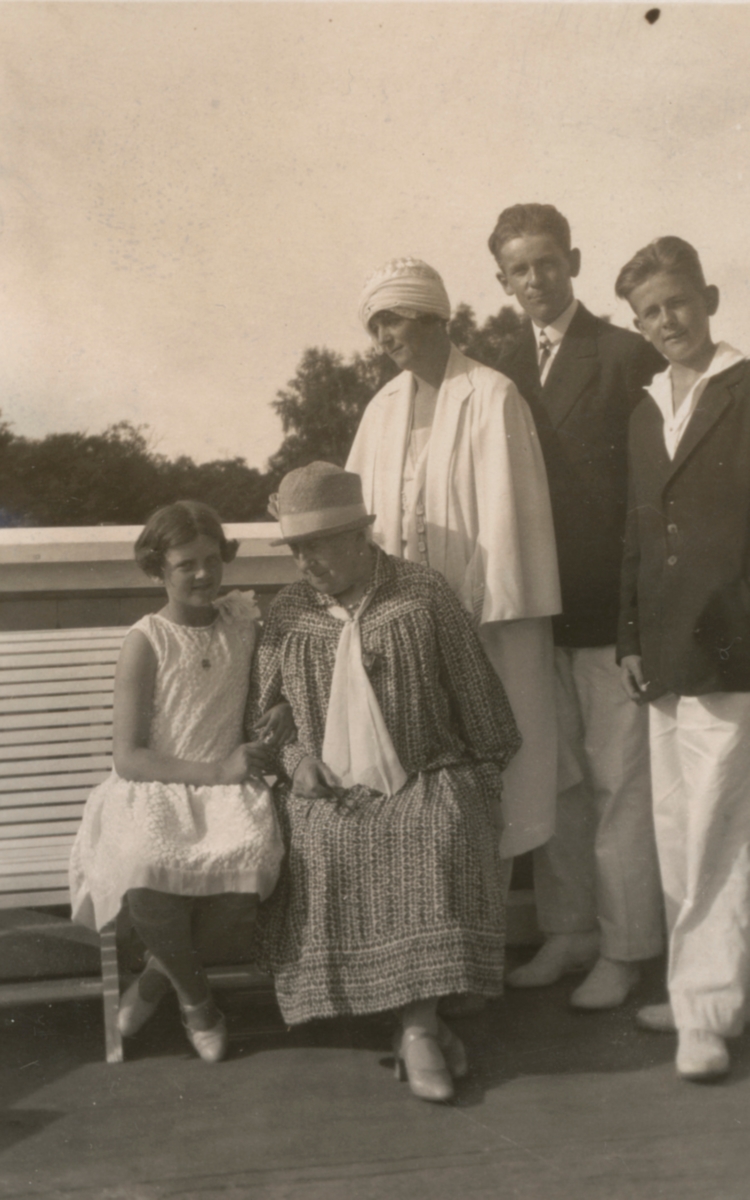 Ulla Ehrensvärd med svärdotter och barnbarn (Anna, Ulla, Gösta och Carl-Augiust Ehrensvärd), taget i Ramlösa på Ullas 70-årsdag, 3/8 1928.