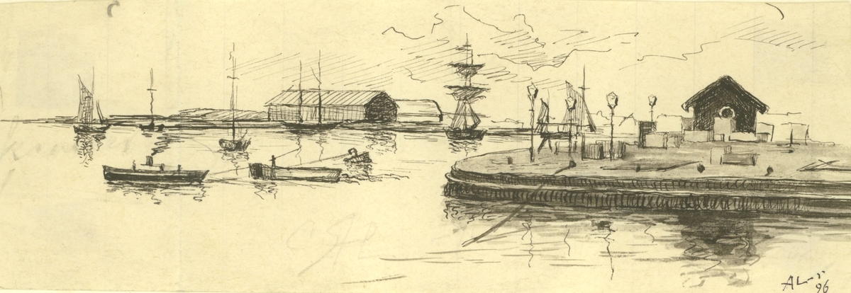 Teckning med segelfartyg i Kalmars hamn av Axel Lekander.