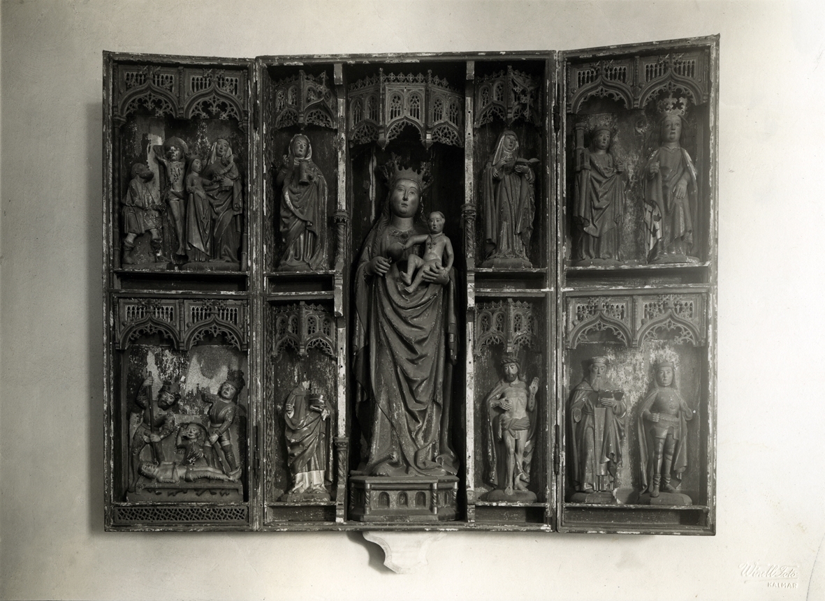 Titel: Det mindre altarskåpet efter restaureringen. Skall vara krigsbyte från Elbing och skänkt av en Bagge på Berga.