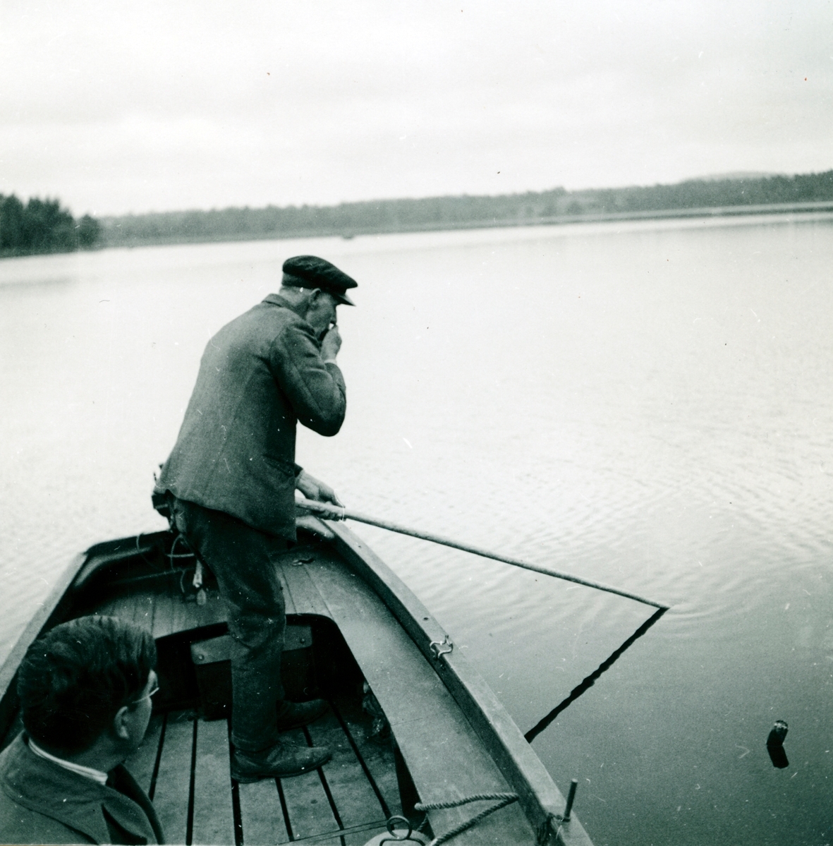 Fiskaren sprutar ut brödsmulor över vattnet där han sänkt ned håven för att locka löjor.