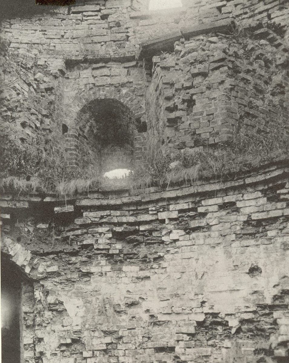 Västra postejen, innerväggen mot väster före skyddstakets uppförande; delar av andra, tredje och fjärde våningens murverk. Mitt i bilden en skottglugg i tredje våningen. Foto M.O. 1933.