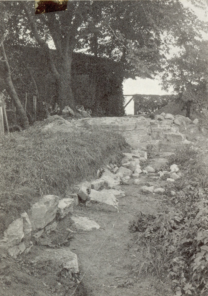 Framgrävda rester av Norra vallens bröstvärnsmur; i bakgrunden till vänster. Östra postejen.