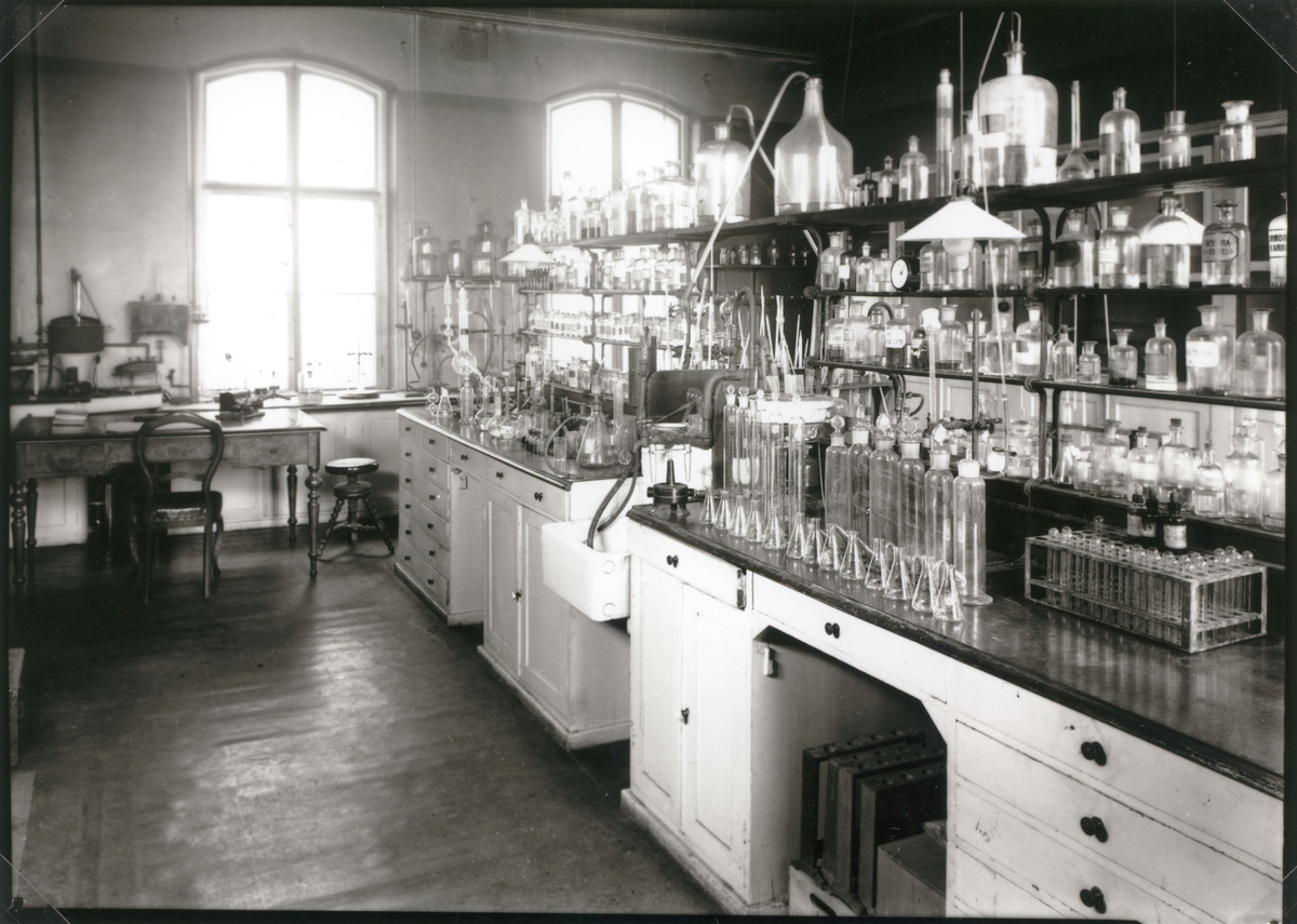 Kalmar Kemiska Station. Laboratorium med glasflaskor och provrör.