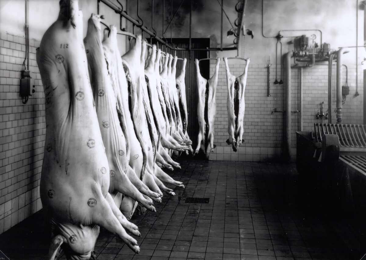Interiör från Kontrollslakteriet i Kalmar. Griskroppar på krokar.