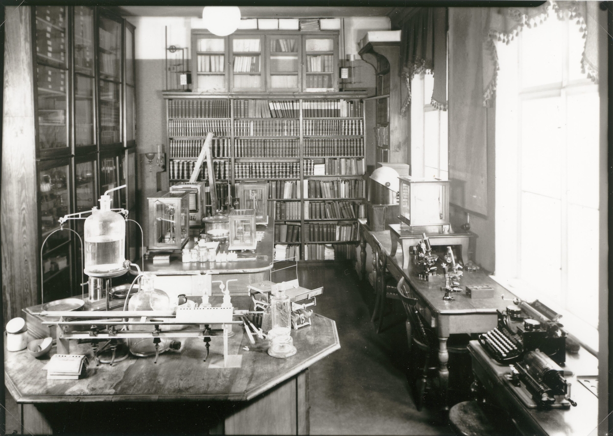 Kalmar Kemiska Station. Laboratorium med bland annat laboratoriekärl, bokhylla och skrivmaskin.
