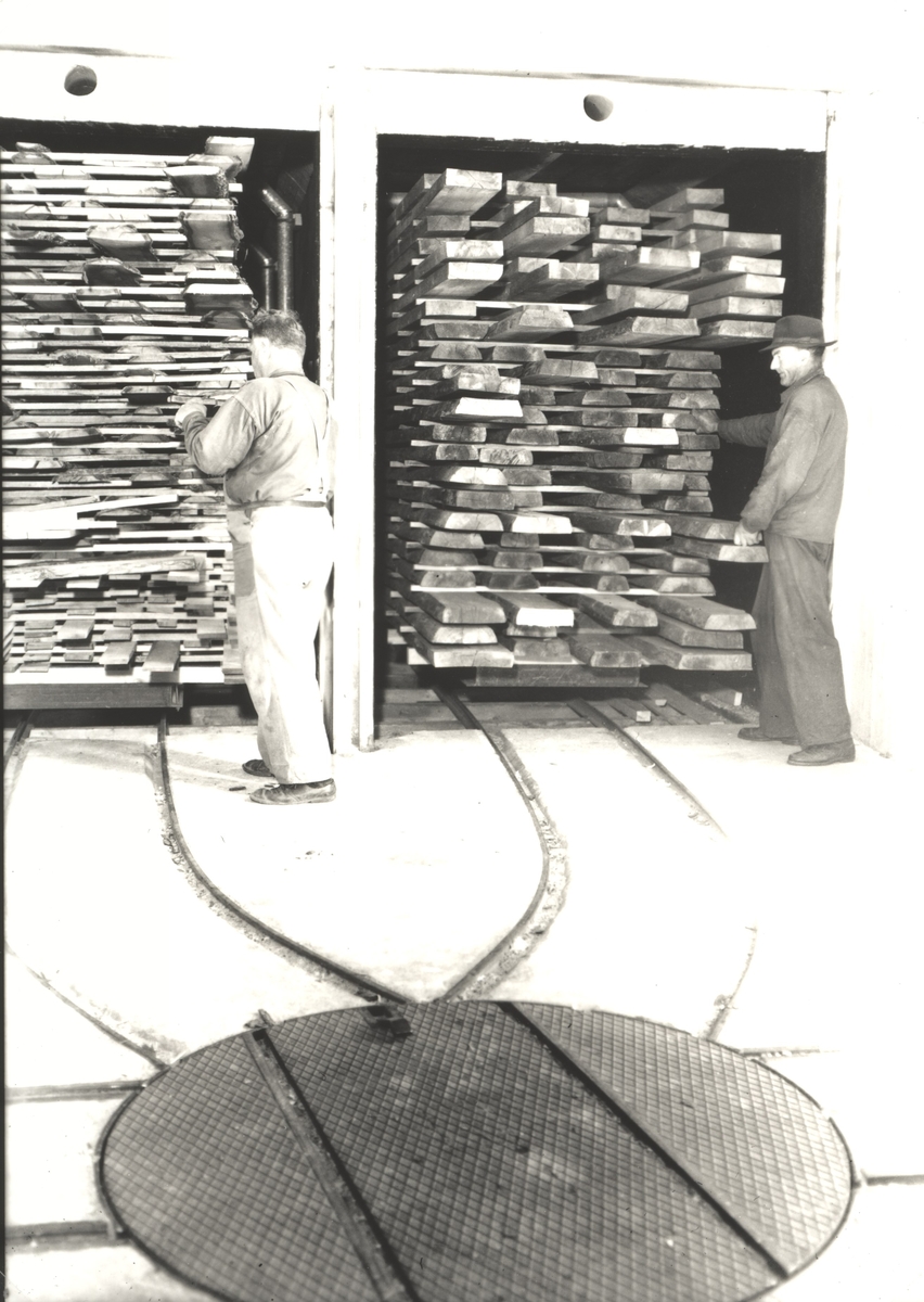 Två män arbetar med bräder på AB Standardsnickerier, Verkstadsgatan i Kalmar.