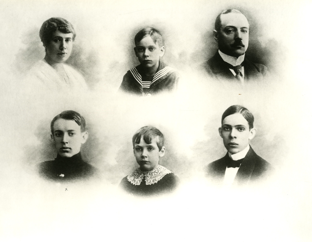 Ett utav grosshandlare Johan Julius och Emma Jeanssons 13 barn. Ragnar L. Jeansson, född 15/7 1873, död 1942. Han var barn nummer 11. Gift med Tyra Bruun, född 30/8 1879. DE fick fyra söner tillsammans Här ses han med sin hustru Tyra och sina fyra söner. Pojken längst upp i mitten heter Sven Jeansson. Pojkarna längst ned från vänster: Ragnar, Nils-Erik, & Gösta Jeansson.