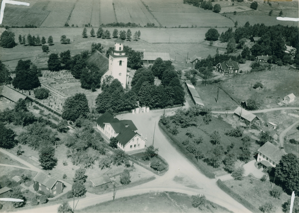 Flygfoto över Mörlunda kyrka.