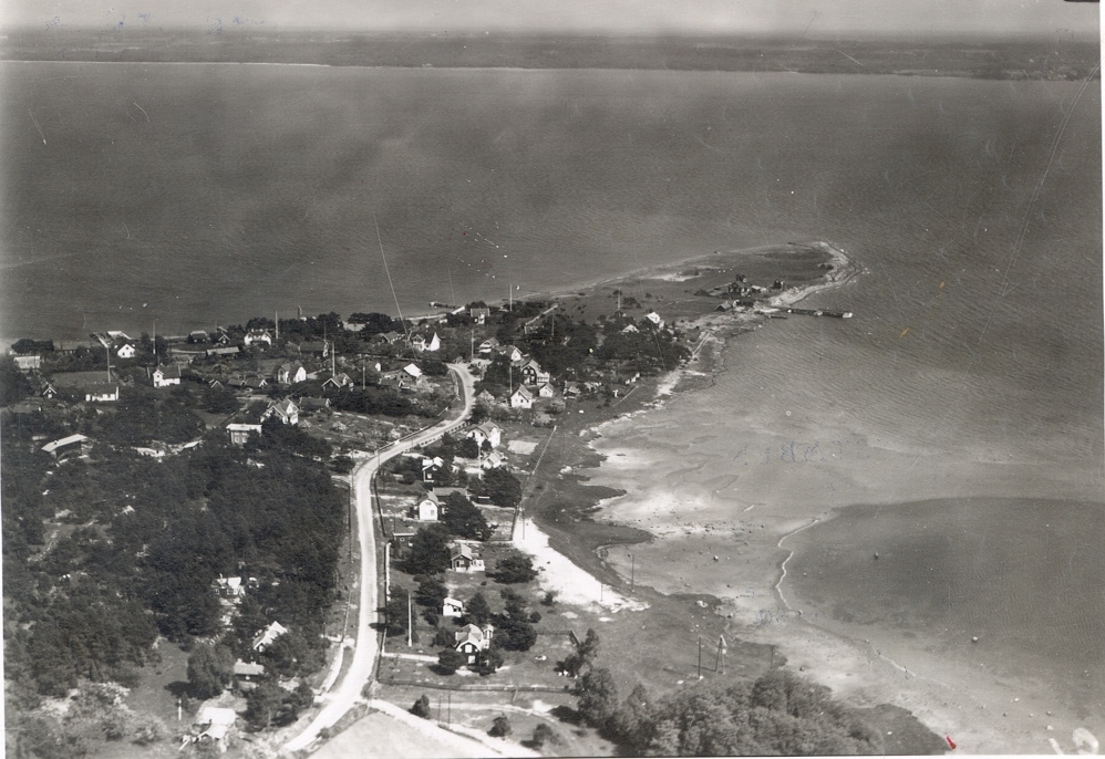 Flygbild från väster över Revsudden på Skäggenäs, en halvö i Kalmarsund norr om Kalmar. Udden som sticker ut i sundet är Södra Revet. På södra sidan av denna udde syns en större brygga, förmodligen för lotsbåtar. Där ligger också den fyr som senare ska komma att ersättas av Sillgrundets fyr.