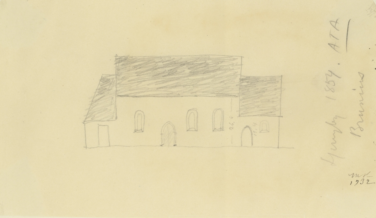 Gamla kyrkan efter teckning av Brunius år 1854. Bruniuska samlingen i Antikvarisk Topografiska Arkivet.