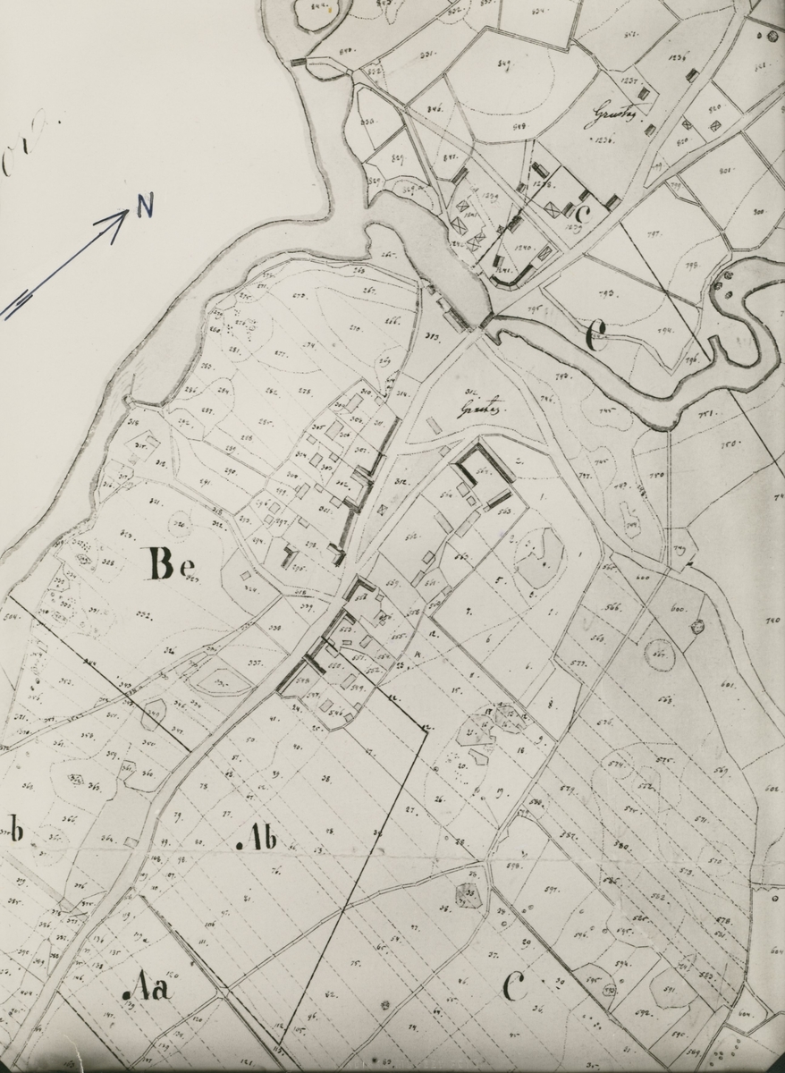 Detalj av lagaskifteskarta över Harby,"Afmätt Åren 1829 och 1830 af J. Tyberg. Kopierad 1837 af N.Lundgren). Skala 1.4000.