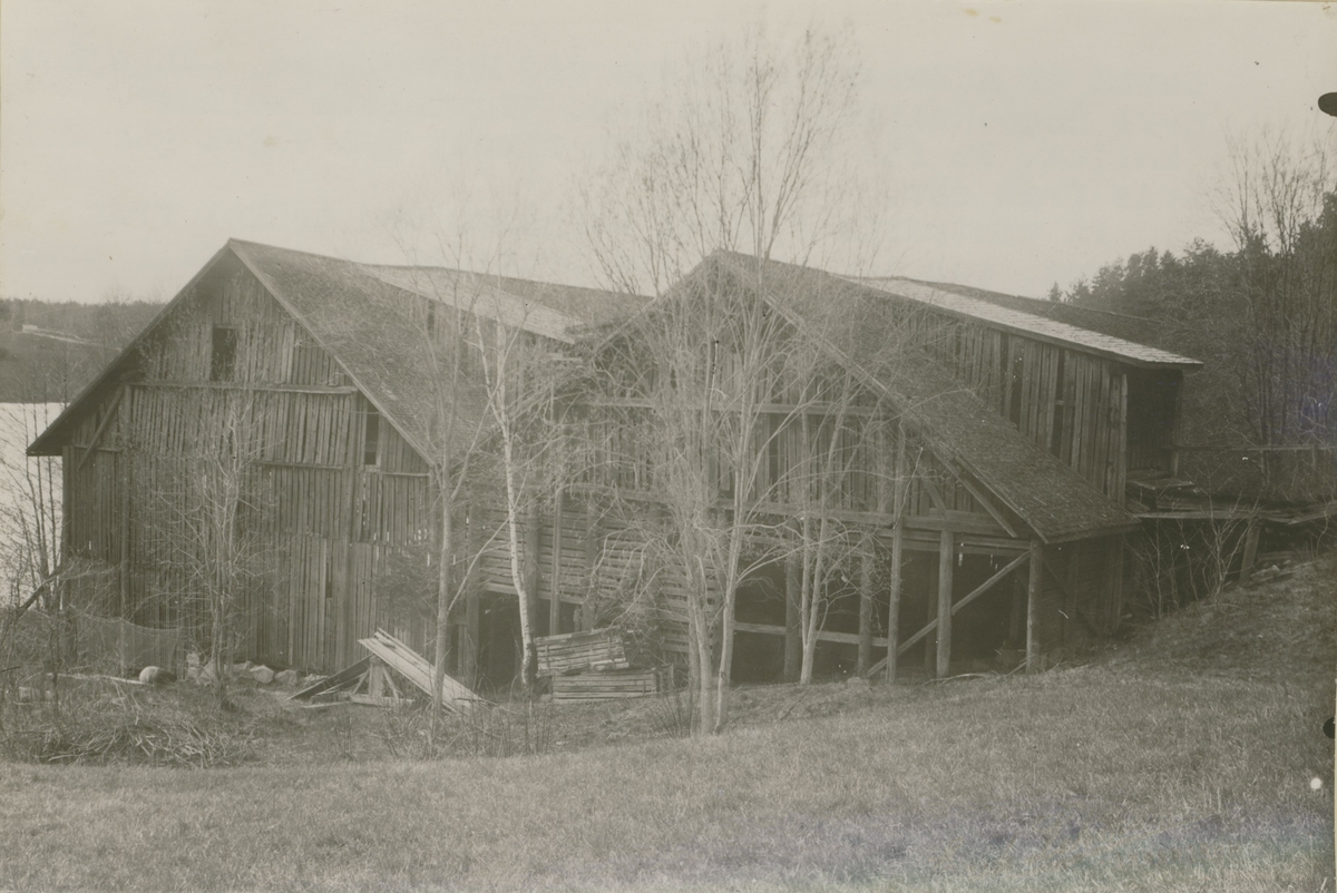 Man ser ingången från backen t.h., och nedanför lite av Långsjön där pråmarna lades intill landgångarna och fylldes. Det var den pråmflotta som nu ligger kvar på Långsjöns botten."