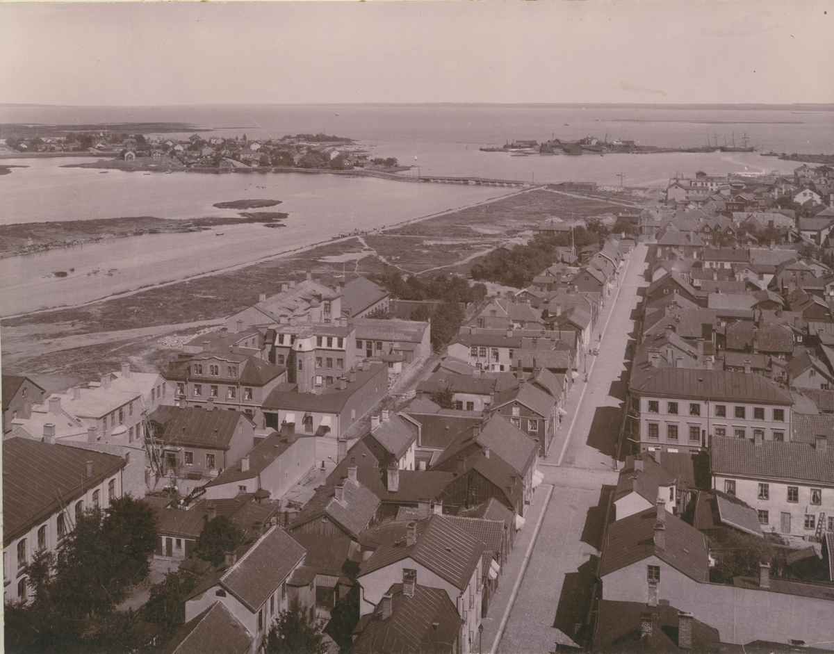 Kvarnholmen från vattentornet. Notera att det ännu inte finns någon bro mellan Ängö och varvet och att Ängö ännu bara har en träbro till Kvarnholmen.
