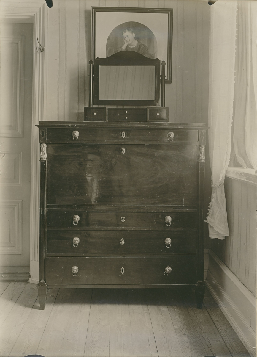 Gästrum på övervåningen i Blekhems herrgård. Byrå i valnöt med mässingsbeslag. På sidorna termer av trä.