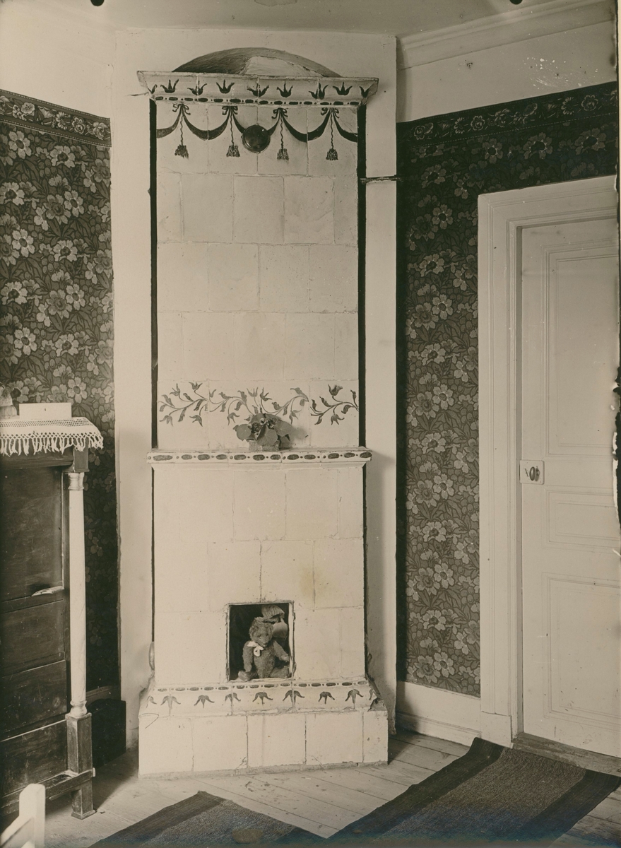 Färjestadens gård. Kakelugn i övre våningen. Gulaktig glasyr med dekor i grönaktigt brunt.