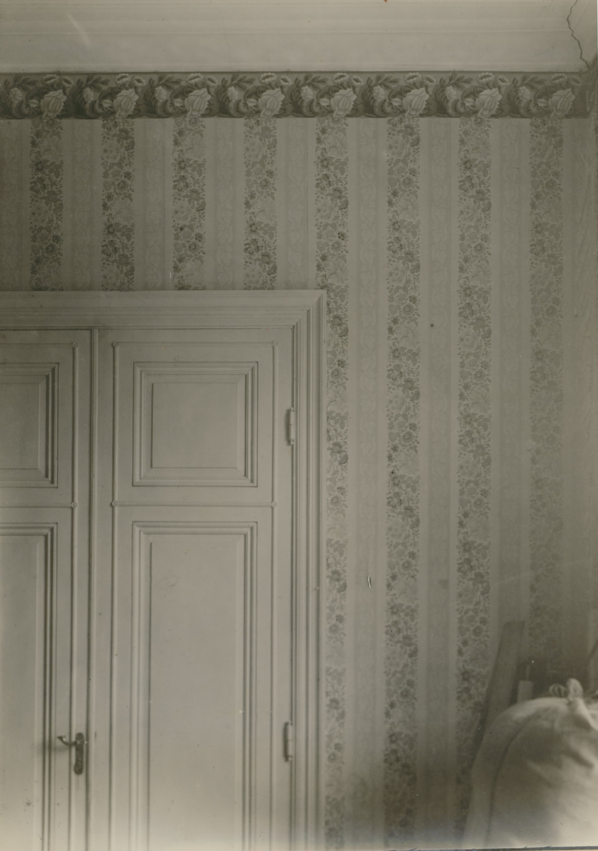 Blekhems herrgård. Byggherrens sängkammare. Papperstapet, våder av korta ark. Smalare ränder med blomranka i ljust grått, bredare ränder med rik blombård i flera färger. Mönstret två gånger på våden. Bård upptill: gröngrå botten, skära blommor med gröna stjälkar och blad. Kakelugn rund, vit, med relieffris, bröstlist men ej skänk.