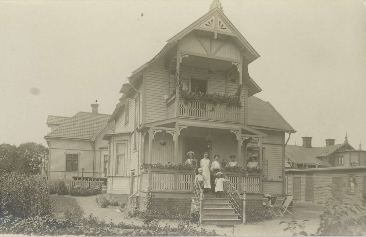 Från vänster; Lily Schmitz, Hulda Schmitz, Otilia Böhme, faster Margit Schmitz, Ellen Johansson, Romano Schmitz och Aina Schmitz. Byggnaden är senare riven.