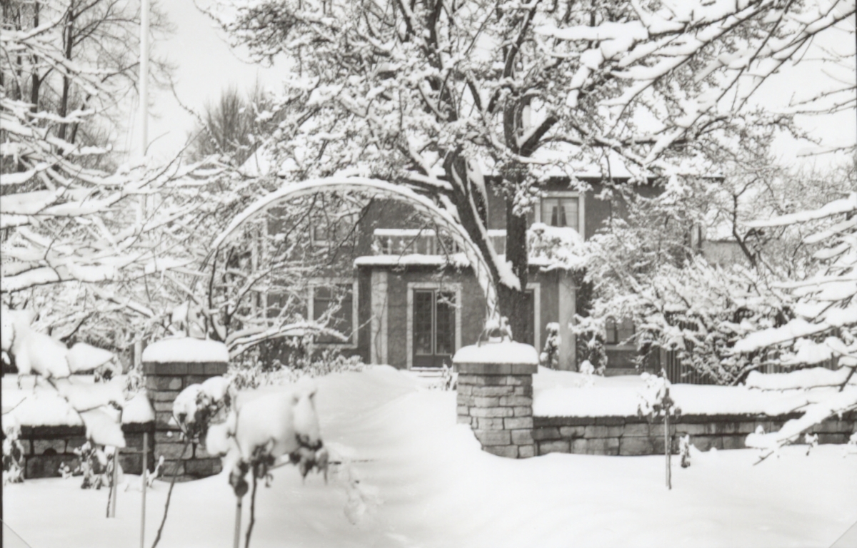 Titel: Ett bostadshus i vintertid och mur med rosenbåge.