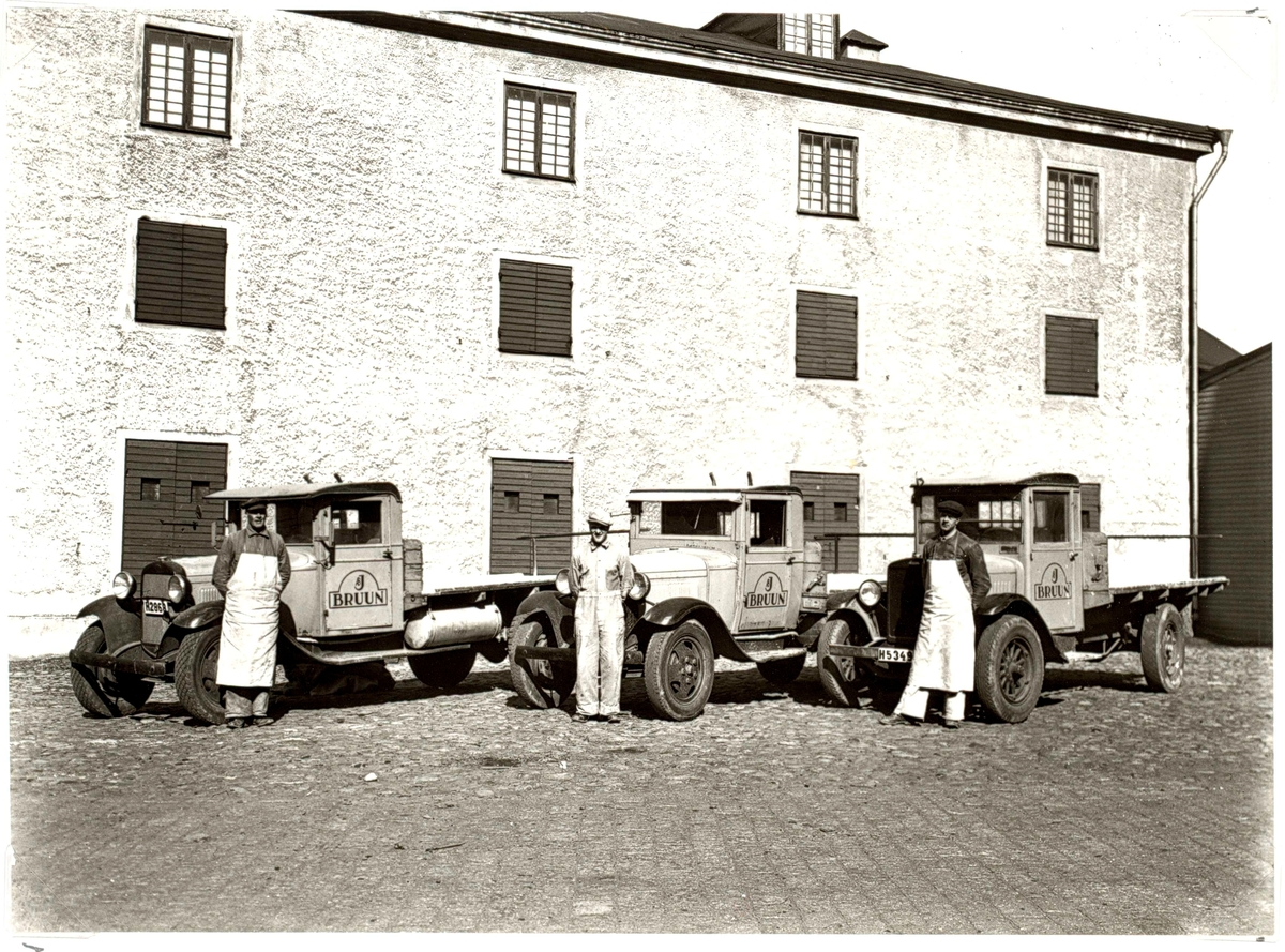 Bilden troligen tagen på Vedgårdsholmen. Tre män med lastbilar.