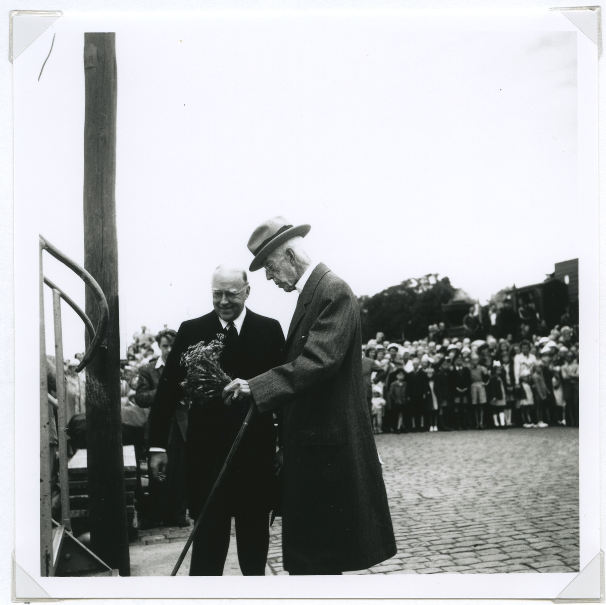 Konung Gustav V bjuds att stiga ombord på Kalmarsundsbolagets färja av Birger Jeansson.
